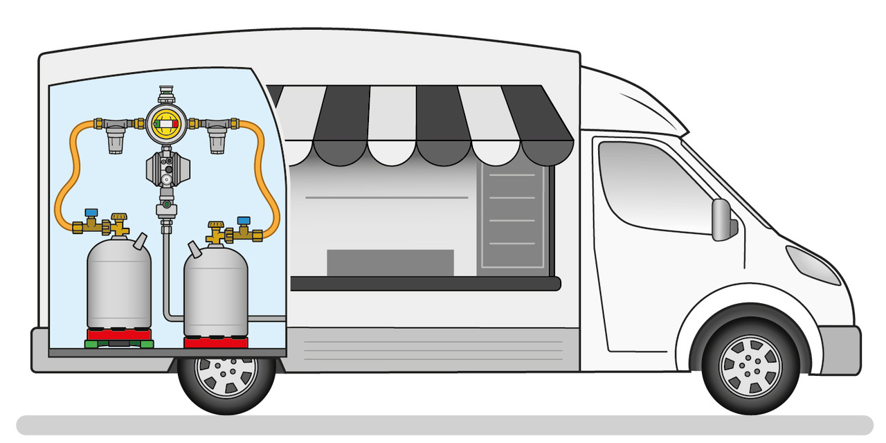 - enthält alle Bestandteile zur Inbetriebnahme einer Zweiflaschenanlage, die zur Gasversorgung während der Fahrt geeignet sind