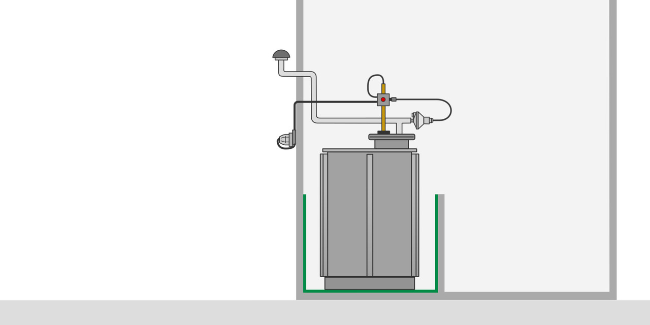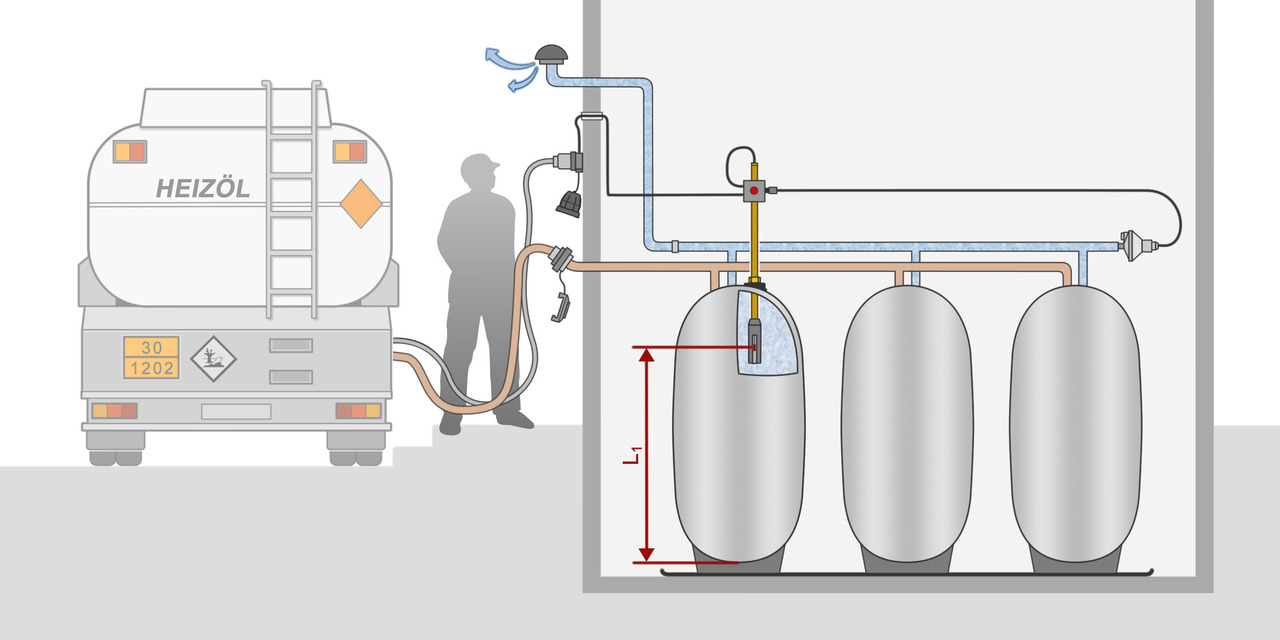 • Besteht keine Einbaumöglichkeit in die tankseitige Lüftungsleitung, darf der Druckwächter DEV in die bauseitige Lüftungsleitung in geringstmöglicher Distanz zum Tank eingebaut werden.