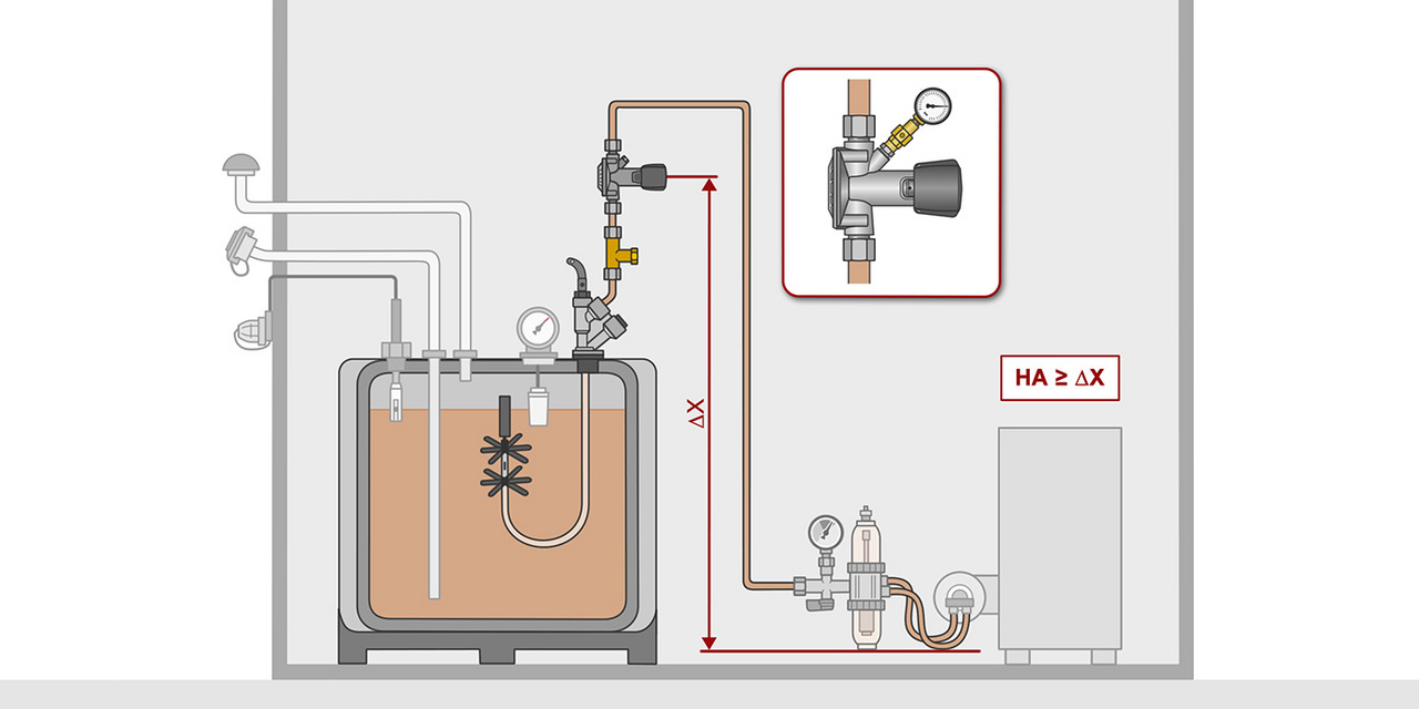 - Der Einbau einer zusätzlichen Druckausgleichseinrichtung als Sicherheitseinrichtung gegen Drucküberschreitung (Typ DAV7, Bestell-Nr. 15 550 00) wird nötig, wenn die Entnahmearmatur am Tank mit einem Rückflussverhinderer ausgestattet ist.