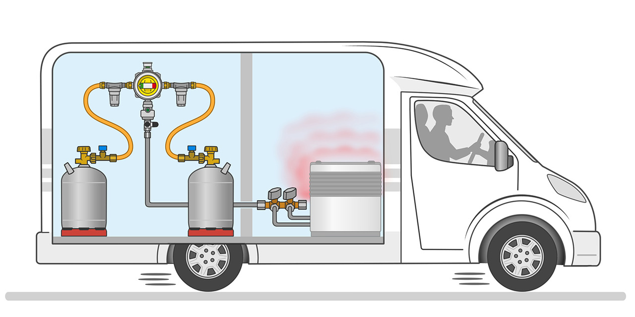 - enthält alle Bestandteile zur Inbetriebnahme einer Zweiflaschenanlage, die zur Gasversorgung während der Fahrt geeignet sind