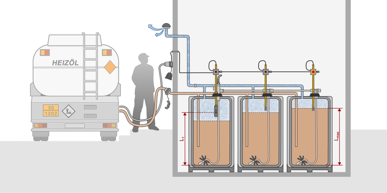 Füllstandssensor FSS als Füllstandsbegrenzer nach DWA-A 791 und Teil einer Sicherheitseinrichtung gegen Überfüllen, der zusammen mit einem vorhandenen Grenzwertgeber im 1. Tank von Batterietanksystemen bei Erreichen des zulässigen Füllungsgrads von 95 % (V/V) eines anderen Tanks eine Überschreitung des zulässigen Füllungsgrads selbsttätig verhindert