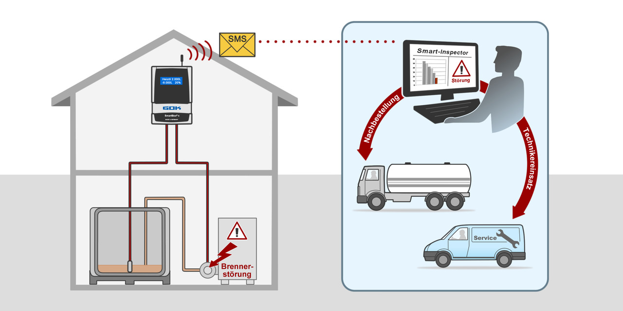 • an die Internetdatenbank www.smart-inspector.com, zur kompletten Überwachung der Anlage. Bei entsprechender Konfiguration kann diese selbstständig Maßnahmen wie Brennstoffbestellung bzw. Technikereinsatz veranlassen.