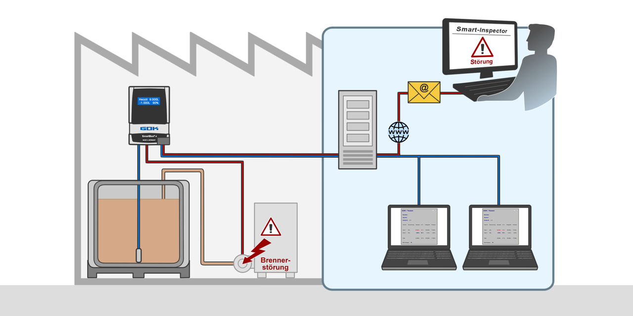 - an die Internetdatenbank www.smart-inspector.com, zur kompletten Überwachung der Anlage. Bei entsprechender Konfiguration kann diese selbstständig Maßnahmen wie Brennstoffbestellung bzw. Technikereinsatz veranlassen.