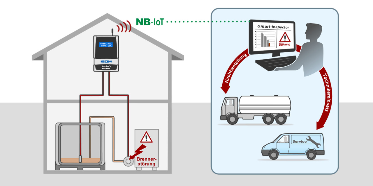 Das integrierte Modem übermittelt weltweit über den Funkstandard NB-IoT Tankinformationen, wie Füllstände und kritische Zustände (Minimalfüllstand, Anlagenstörung z. B. Brennerstörung, Leckagemeldung etc.).