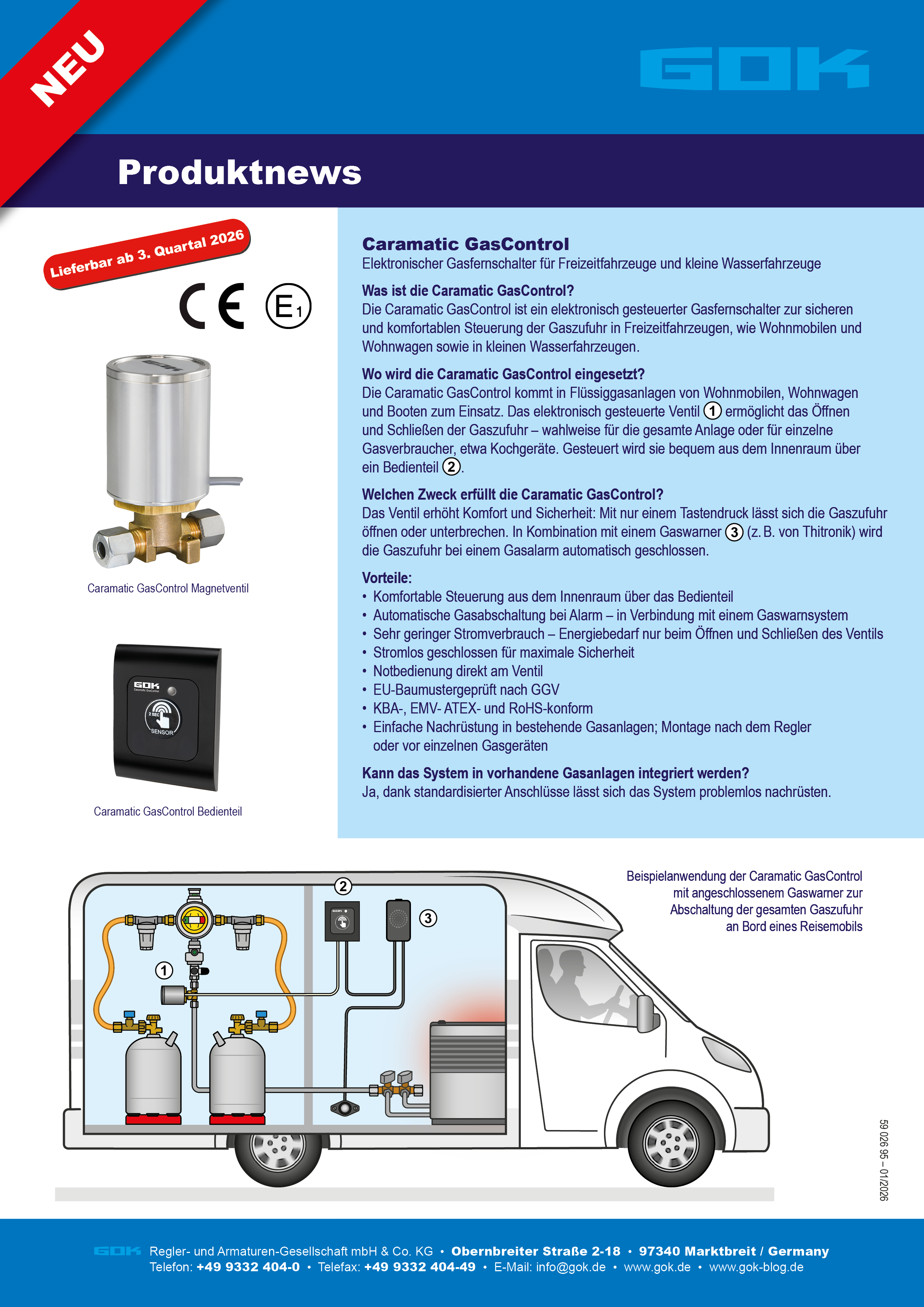 The Caramatic GasControl is an electronically controlled remote gas shut-off valve that has been developed for maximum safety and convenient operation in leisure vehicles such as motor caravans and caravans, as well as in small watercraft.