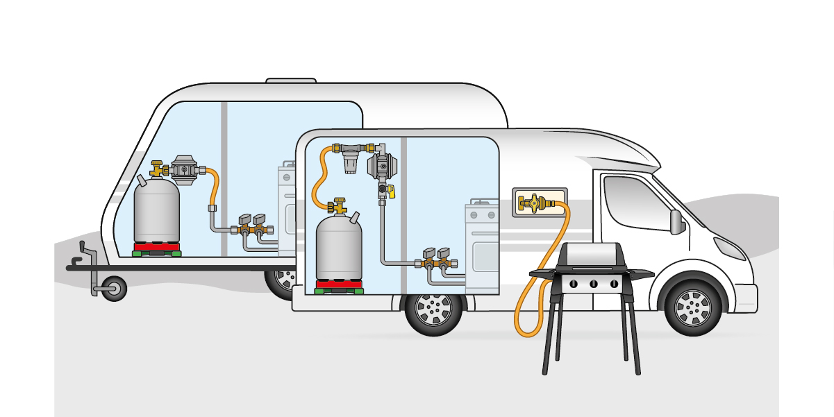 - The presented connection solution for caravans and motorhomes is the classic method of connecting a gas cylinder to the supply line of the vehicle. The low pressure regulator is connected directly to the gas cylinder. The medium pressure hose assembly creates the connection to the vehicle’s supply line.