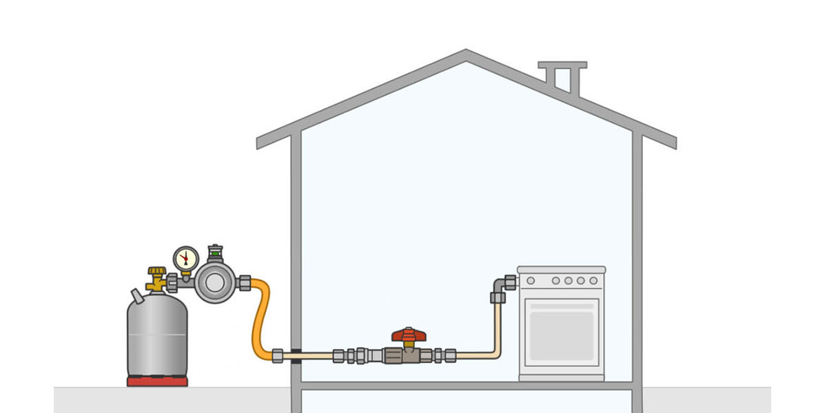 The gas cylinder is outside. Therefore, a low pressure regulator with over-pressure safety device S2SR with visual indicator and optionally with test pressure gauge is used. A flexible hose assembly connects the pressure regulator to rigid piping which is laid through the wall of the building. Inside is a ball valve with thermal cut-out device "T".
