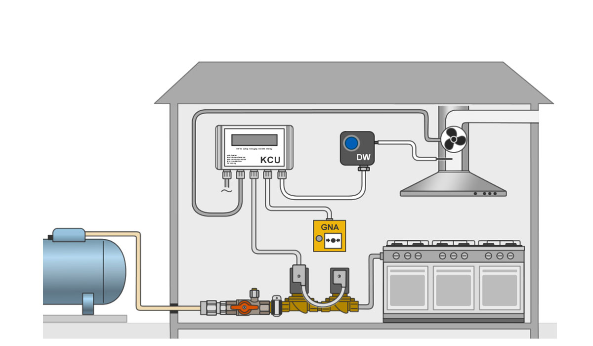 The central control unit KCU coordinates the individual components like pressure monitor DW and the solenoid valves including upstream ball valve with integrated thermal cut-out device "T". The cooker and hobs receive LPG only when the extractor hood is working.