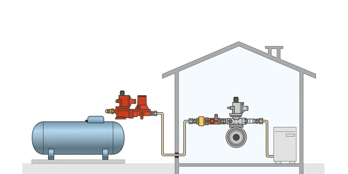 The medium pressure regulator of the 1st stage is connected directly to the LPG tank. The regulator set of the 2nd stage with safety diaphragm AD and excess flow valve GS is installed after the house lead-in.