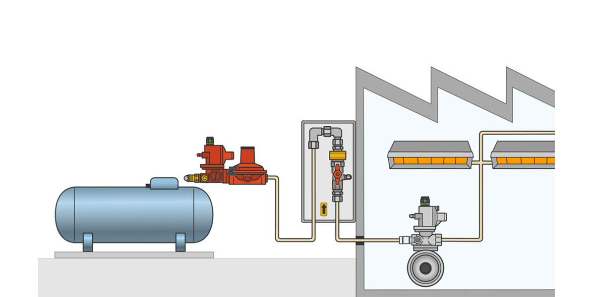 The medium pressure regulator of the 1st stage is connected directly to the LPG tank. The house connection box is installed in front of the house lead-in, the low pressure regulator of the 2nd stage with safety diaphragm AD after the house lead-in.