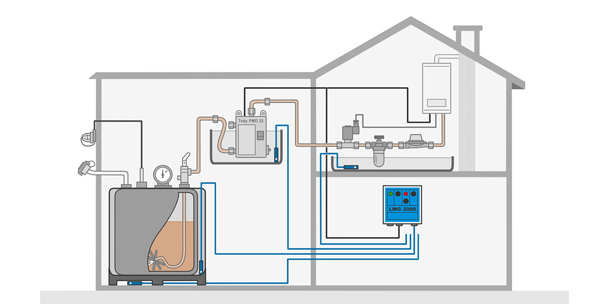The leak alarm type LWG 2000 monitors installations for storing, filling and transferring substances hazardous to water and reliably reports any leaks that occur. As soon as a liquid reaches the probe of the leak alarm, a visual and acoustic alarm is triggered.
