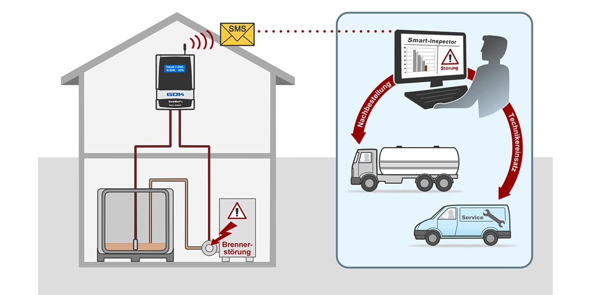 SmartBox 4 measures the contents by means of the level probe and shows it locally. In addition to the filling level in the fuel oil consumer installation, the operation of the oil burner is monitored for malfunctions. SmartBox sends the filling level data by text message to the Internet database www.smart-inspector.com. There, the operator can monitor the filling level and in the event of a burner malfunction, the service technician is notified directly.